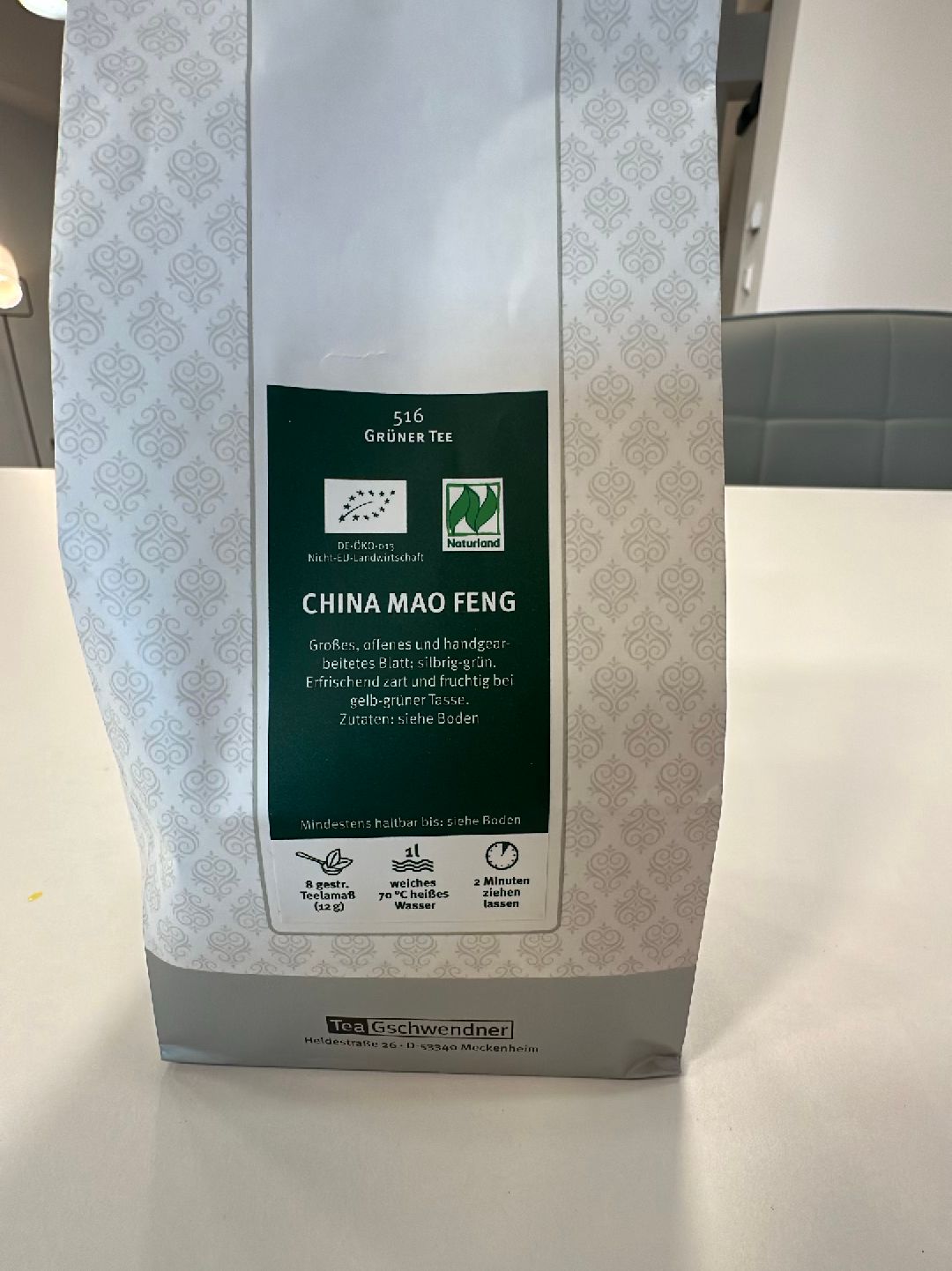 China Mao Feng ist ein hochwertiger biologischer Grüntee aus der Provinz Anhui in China, der aus der Knospe und dem ersten Blatt der Teepflanze handgepflückt und schonend paniert wird. Er zeichnet sich durch silbrig-weiße Flaumbehaarung aus, die an verschneite Berggipfel erinnert, und ergibt eine hellstrohgelbe Tasse mit fruchtig-blumigem Aroma, leichter Röstnote und subtiler Bitterkeit. Zubereitung: 12 g (8 Teelöffel) auf 1 L weiches Wasser bei 70°C, 2 Minuten ziehen lassen. Zertifiziert bio (DE-ÖKO-013) und Naturland.